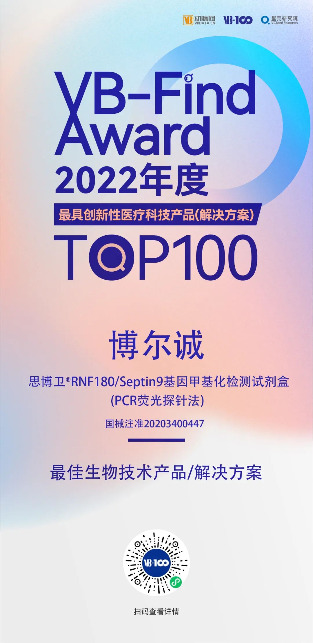2022年12月14日-15日,由動脈網、VB-100、果殼研究院主辦的2022醫療科技世界峰會于蘇州召開。“VB-FindAward:2022年度最具創新性醫療科技產品(解決方案)TOP100”榜單也于此盛會上正式發布。此次榜單聚焦生物技術、數字及信息技術、新材料與智能制造技術三大領域,基于應用價值、驅動支持、創新迭代、互動傳播四個維度,評選出最具創新性的產品和解決方案。憑借在癌癥早篩早檢領域的突破性領先技術,博爾誠旗下思博衛® RNF180/Septin9基因甲基化檢測試劑盒(PCR熒光探針法)成功斬獲最具創新性醫療科技產品獎項