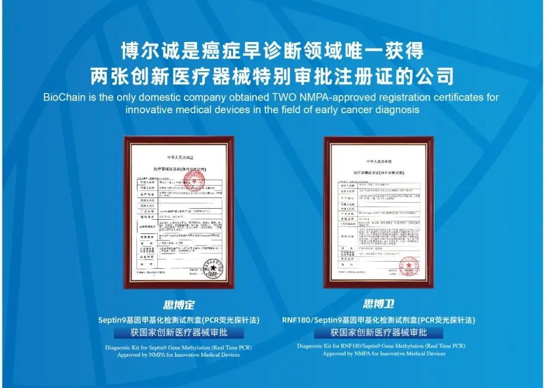 多年以來,博爾誠不忘“讓更多人遠離重大疾病”之初心,從未停止創新的腳步,不斷針對消化道癌癥早篩早診進行探索。2015年,博爾誠旗下結直腸癌早檢產品思博定®Septin9基因甲基化檢測試劑盒(PCR熒光探針法)通過NMPA創新醫療器械特別審批(國械注準20153401481),是我國首款獲批的結直腸癌基因甲基化檢測試劑盒,現已納入福建省、北京市、上海市等多地醫保。博爾誠自主研發的食管癌甲基化基因檢測試劑盒現的臨床試驗已基本完成,該試劑盒通過聯合檢測多個食管癌相關基因的甲基化水平,可實現對早期食管癌的高效檢測,有望填補早期食管癌甲基化檢測空白。